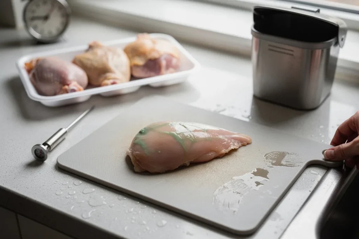 Vágáskor célszerű műanyag vágódeszkát használni, amelyet könnyebb tisztítani és fertőtleníteni. A fa vágódeszkákat kerülni kell, mert gyakran valódi baktériumok melegágyává válnak.