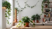 Bent három szintű polcokat rendeztek be, és mindegyik fölé növényi lámpákat szereltek. Így egy igazi zöld sarok jött létre, amely télen kissé kompenzálja a nyár hiányát.